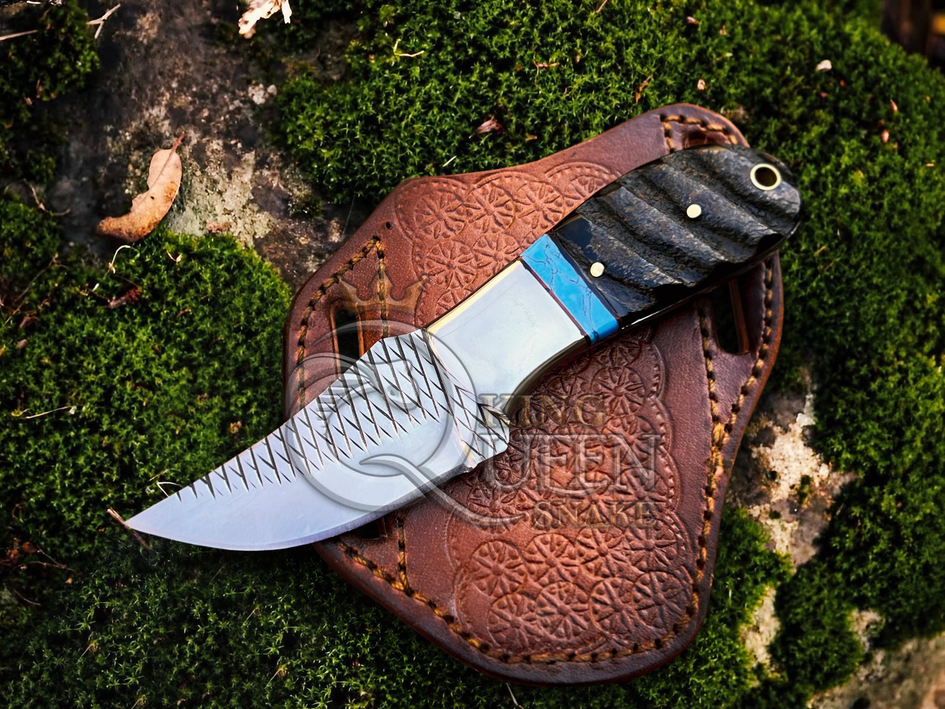 King Queen Snake knife is Hand Forged from genuine Damascus steel, making it a standout addition to any art collection while also being functional for everyday use. The intricate twist patterns on the blade not only showcase the craftsmanship but also enhance its durability and sharpness. With an ergonomic handle designed for comfort and balance, each knife offers a secure grip and ease of use, whether you're preparing a meal or enjoying outdoor activities.